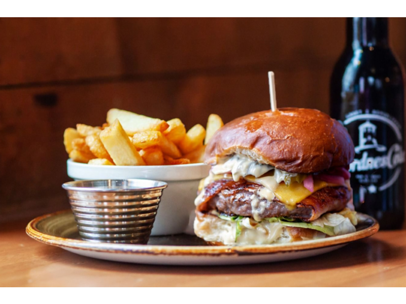 160g oksekjøtt, bacon, blåmuggost, BBQ-saus, syltet agurk, salat