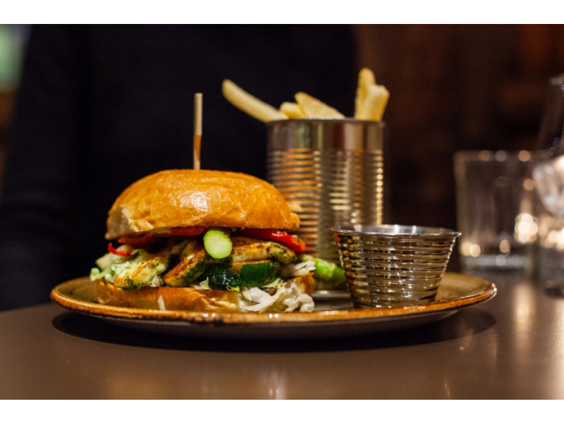 Fritert eldost fra Hardanger Bygdeysteri i Øystese, grillede grønnsaker, spicy hummus, Tzatziki, salat